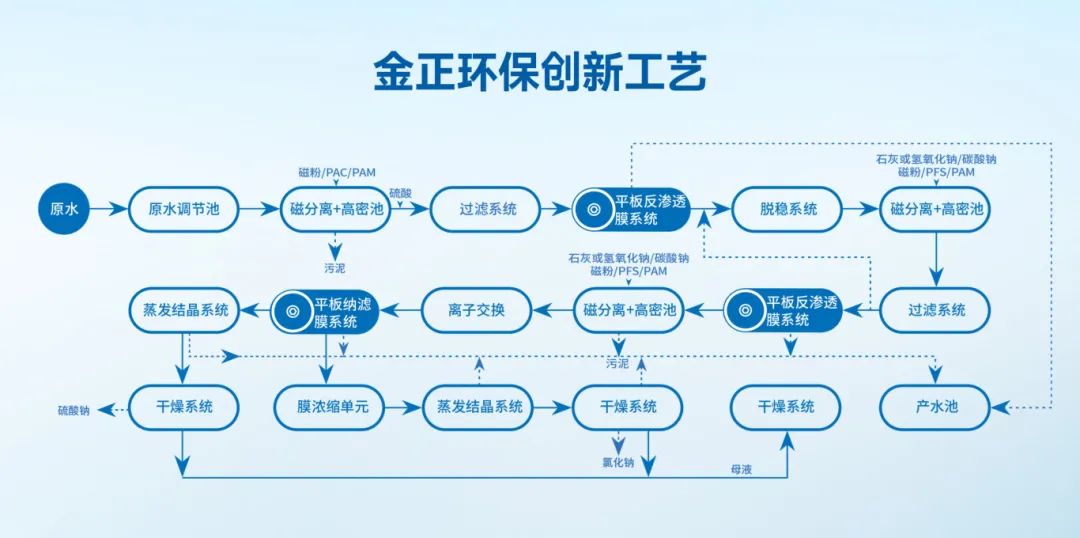 金正環(huán)保煤礦礦井水零排放及資源化利用解決方案,以更短、更高效的流程實(shí)現(xiàn)礦井水深度處理及資源化利用,為煤礦及煤化工企業(yè)提供運(yùn)行成本低、固廢產(chǎn)出量少、膜系統(tǒng)運(yùn)行穩(wěn)定的創(chuàng)新工藝。該工藝分為四個(gè)工藝段,依次是預(yù)濃縮工藝段、脫穩(wěn)濃縮工藝段、深度濃縮工藝段、蒸發(fā)結(jié)晶工藝段。各工藝段可根據(jù)來(lái)水水量、水質(zhì)進(jìn)行不同的裝備和工藝組合,實(shí)現(xiàn)模塊化、標(biāo)準(zhǔn)化運(yùn)行,有效解決傳統(tǒng)卷式膜元件易污堵問(wèn)題,實(shí)現(xiàn)高倍濃縮和分鹽,減少蒸發(fā)量,大大降低蒸發(fā)投資及運(yùn)行成本,保證系統(tǒng)整體穩(wěn)定運(yùn)行。相比傳統(tǒng)工藝,藥劑用量減少≥80%,軟化污泥產(chǎn)量減少≥60%,去除鈣離子≥70%,成本降低≥60%。